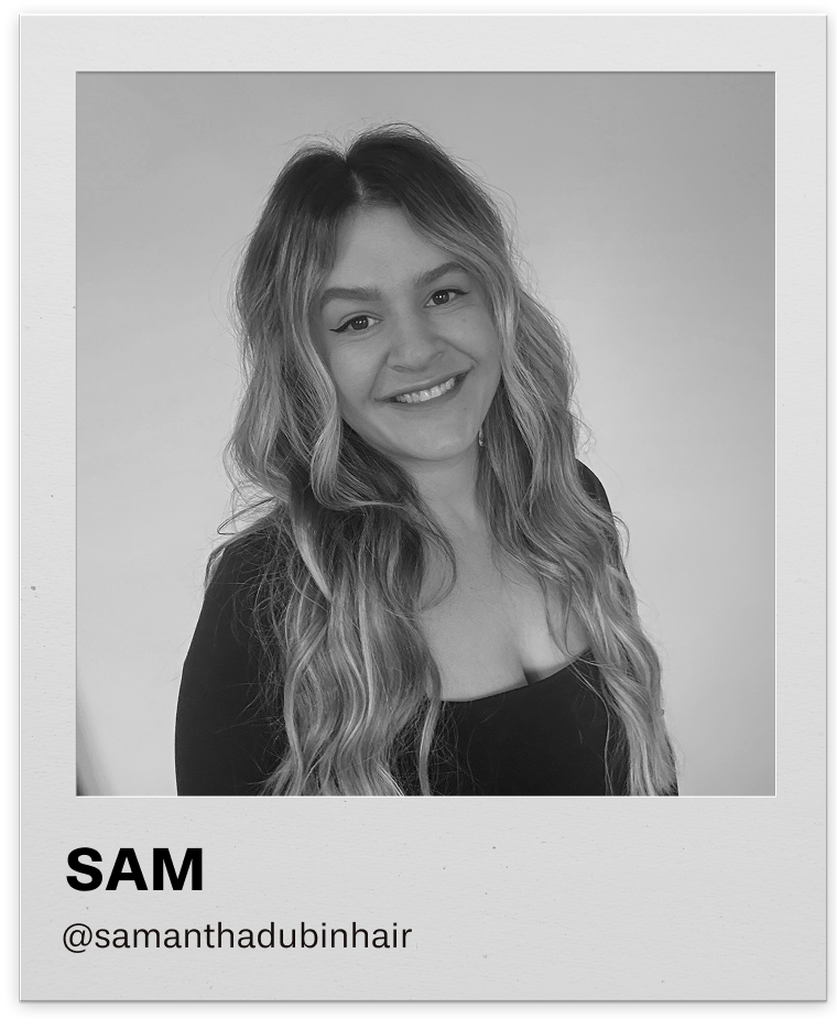When not doing hair, Sam is hanging with her husband and daughter, navigating new-homeowner life, solving fake crimes through true-crime shows, and folding laundry like it’s her side hustle and honestly loving every second of it.